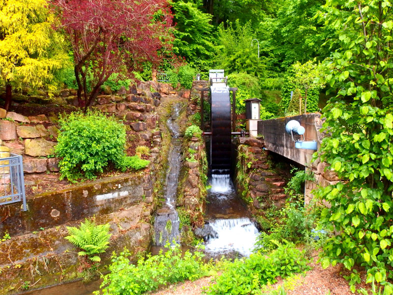 Gleich zu Beginn der Tour treffen wir auf das mächtige Mühlrad der ehemaligen Walzenmühle