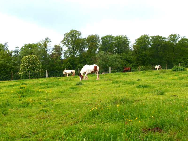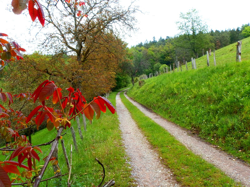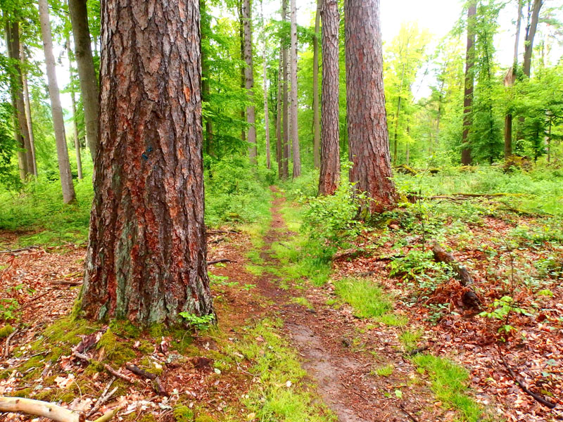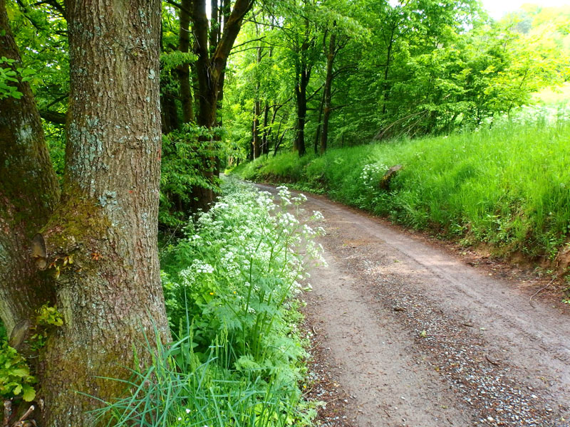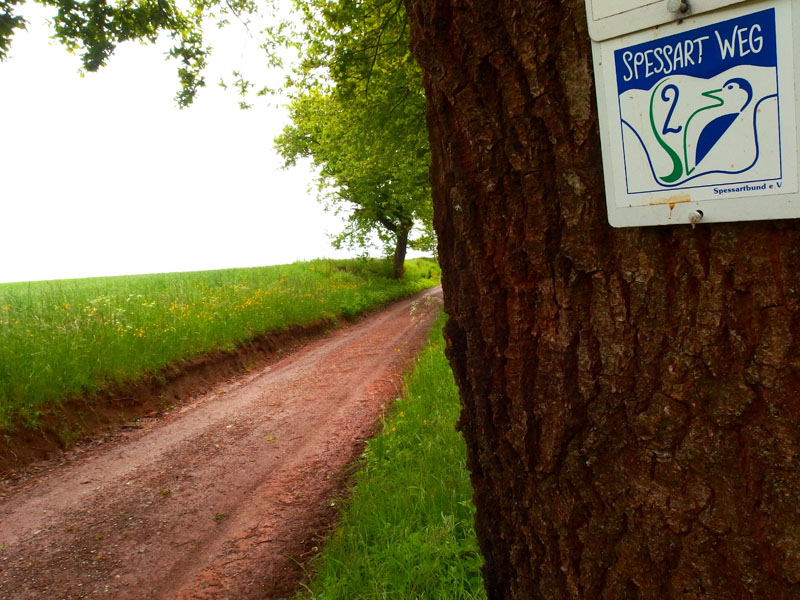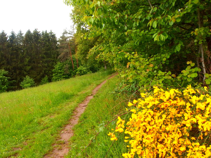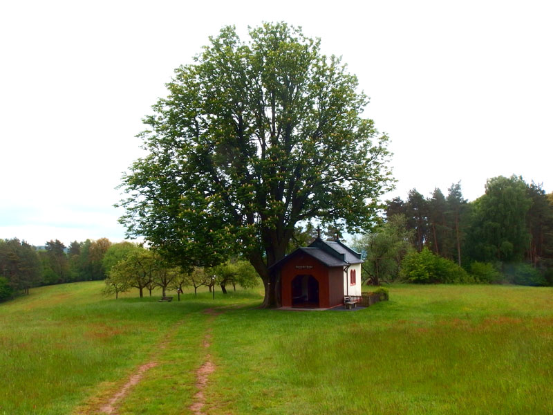 Im ständigen Wechsel werden jetzt, lang anhaltend bergauf wandernd, schmale Pfade und breite Waldwege beschritten. Als wir schließlich die Spessarthöhen erklommen haben, zeigt sich auf einem weitläufigen Wiesenplateau und direkt unter einem ausladenden Kastanienbaum die Kapelle "Herrin der Berge". Peter Spieler ließ das kleine Kirchlein im Jahre 1853 erbauen, als Dank für die Errettung aus Seenot bei seiner Überfahrt nach Amerika. Die Kapelle wurde mit einem hölzernen Vorbau ausgestattet, der auch als Schutzhütte für Wanderer genutzt wird. Darüber hinaus hat man von hier oben einen herrlichen Weitblick über die waldreichen Erhebungen des Spessarts. Vom Kapellchen läuft der Räuberland-Pfad in einem scharfen Rechtsschwenk in Richtung Volkersbrunn. Blühende Ginsterstauden setzen erfrischende Farbtupfer in der sattgrünen Frühlingslandschaft, bevor wir wieder in den spessarttypischen Mischwald eintauchen.