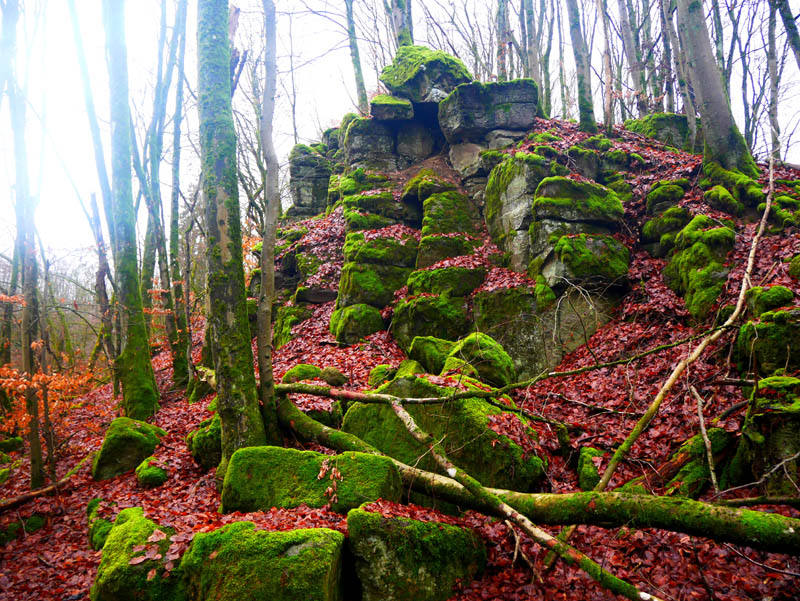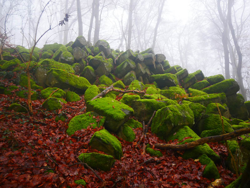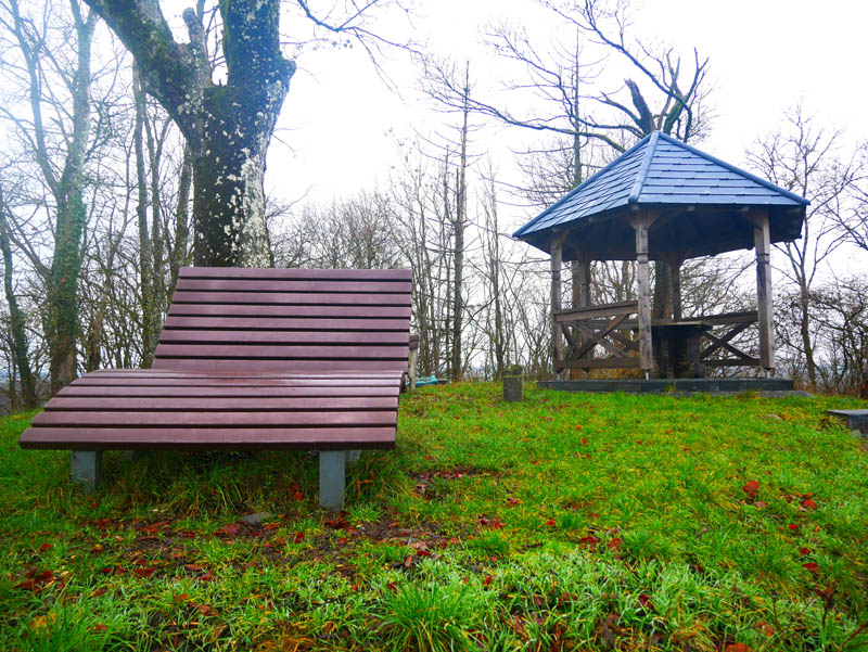 Wir durchmessen die Ortschaft Weltersburg und steigen auf schmalen Pfaden, zum Schluss gar über steinerne Treppenstufen zum Gipfel des Burgbergs hinauf. Im Mittelalter befand sich auf der Basaltkuppe des Weltersburger Kopfes eine salische Reichsburg, die von den Herren zu Sayn und Isenburg erbaut und betrieben wurde. Im hohen Mittelalter war die Weltersburg nach zwei Eroberungen bereits in einem schlechten Zustand und im Jahre 1670 vollkommen verfallen. So ist von dem mittelalterlichen Gemäuer heute nichts mehr zu sehen. Eine hölzerne Wanderhütte und eine Waldliege laden am ehemaligen Standort der Burg zur Rast ein und ermöglichen traumhafte Aus- und Fernblicke über den Westerwald bis weit in das Limburger Becken. Auch der Startpunkt Girkenroth ist von dieser hohen Warte im Südosten gut zu sehen.